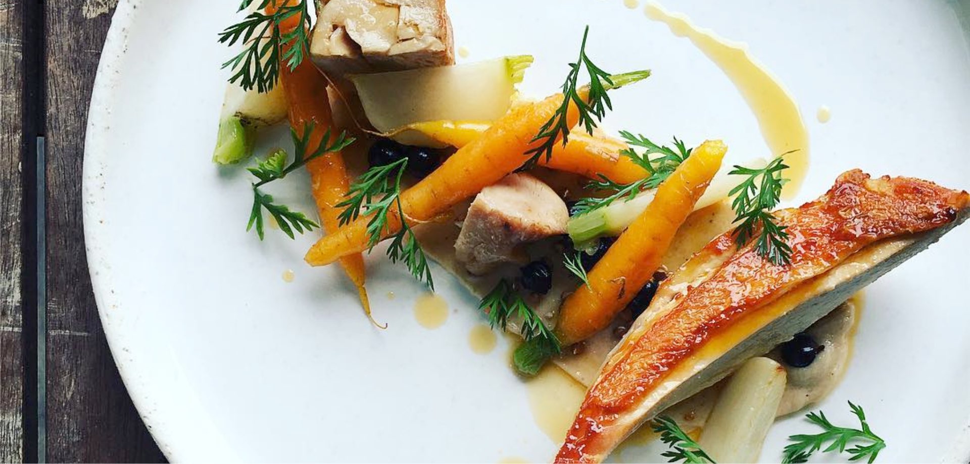 éponge et pesto de roquette/sorbet chèvre et poivre/pétillant rouge «l'envol»
